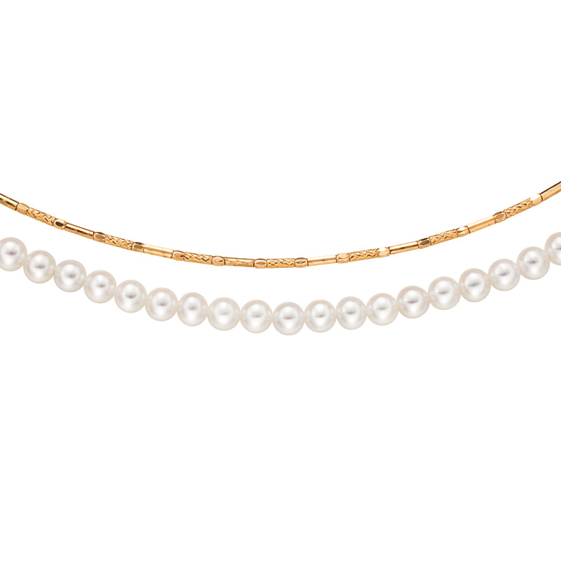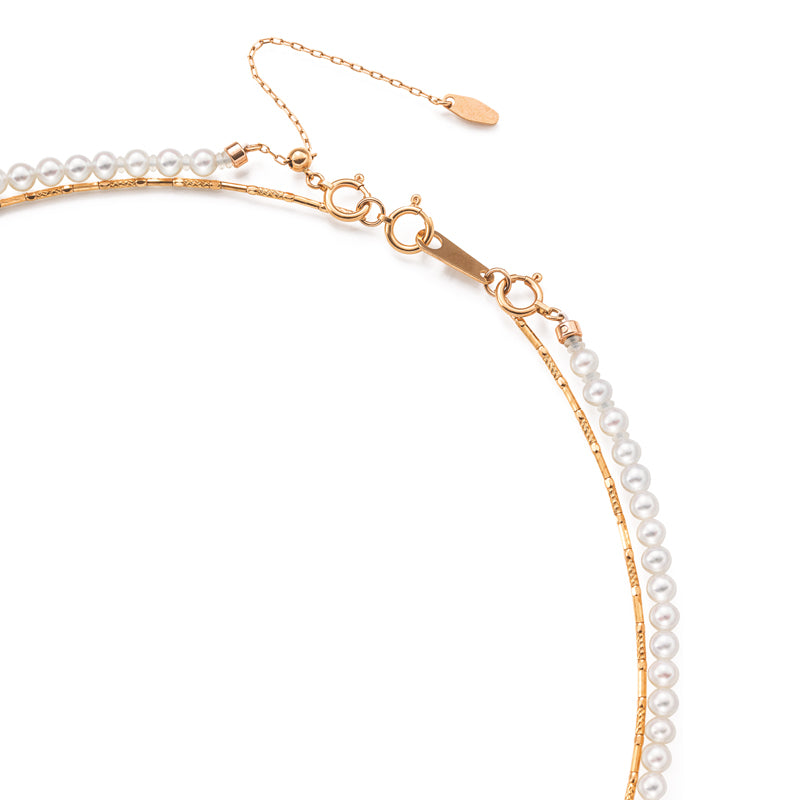 淡水パールのやさしい輝きと、K18ピンクゴールドのやわらかな色合いが美しく調和した二連ネックレス。